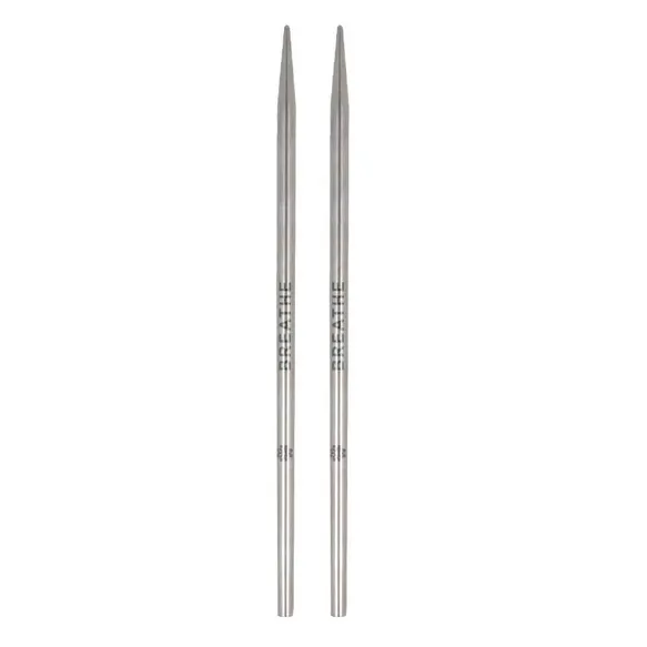 Gładko wykończone końcówki wykonane z trwałej, nadającej się do recyklingu stali nierdzewnej. Stopniowo zwężająca się końcówka pozwala drutom łatwo przechodzić przez oczka. Oprócz oznaczenia rozmiaru, każdy drut zawiera również inspirujące słowo, które pomaga skupić się na chwili obecnej.