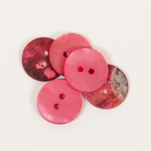 Czerwony, okrągły guzik z masy perłowej o średnicy 15 mm.