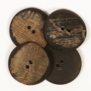 Rogowy, ciemny guzik z lekko zeszlifowanymi krawędziami, średnica 25 mm.