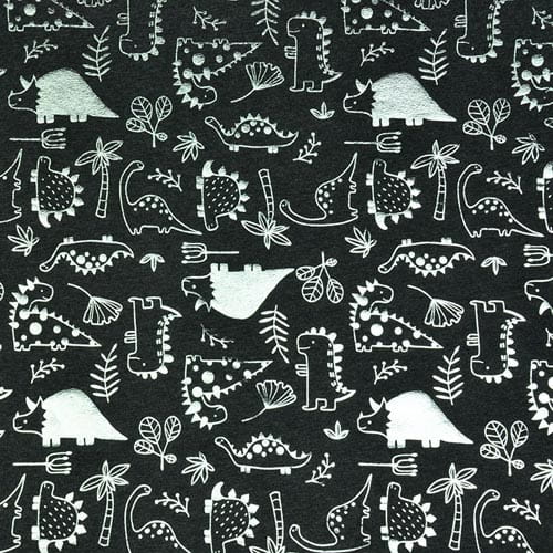 Ciemno szary jersey bawełniany w dinozaury z błyszczącej srebrnej folii. Dzianina T-shirt jest rozciągliwa dzięki dodatkowi elastanu. Uszyjesz z niej wspaniałe T-shirt, bluzki, spódnice, leginsy i sukienki.