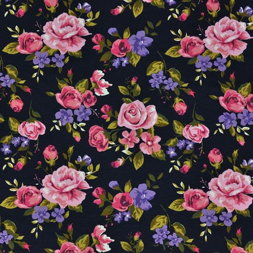 Granatowy jersey bawełniany w różowe i fioletowe kwiaty. Dzianina T-shirt jest rozciągliwa dzięki dodatkowi elastanu. Uszyjesz z niej wspaniałe T-shirt, bluzki, spódnice, leginsy i sukienki.