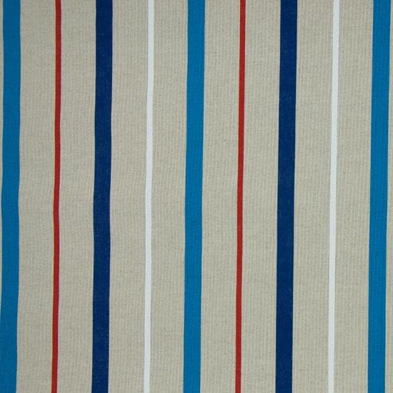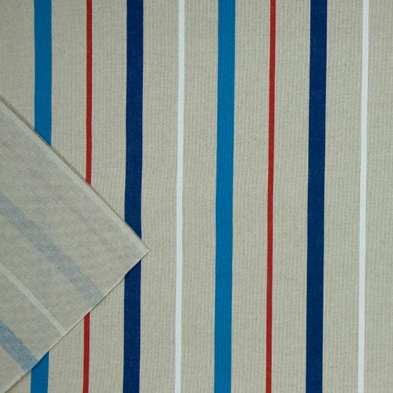 Materiał pół panama PREMIUM, z wzorem w niebieskie, granatowe i czerwone pasy na tle wyglądem przypominający len. To świetny materiał na poduszki i torebki, nadaje się na bieżniki i obrusy i wiele innych dodatków do domu.
