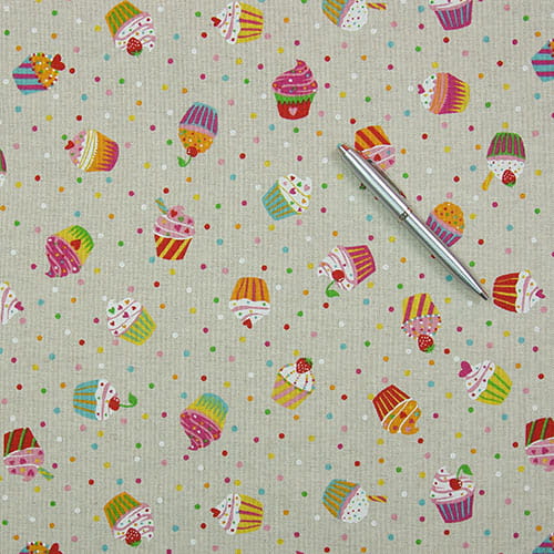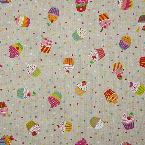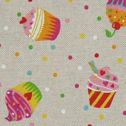 Materiał pół panama PREMIUM, z wzorem w muffinki na tle wyglądem przypominającym len. To świetny materiał na poduszki i torebki, nadaje się na bieżniki i obrusy i wiele innych dodatków do domu.