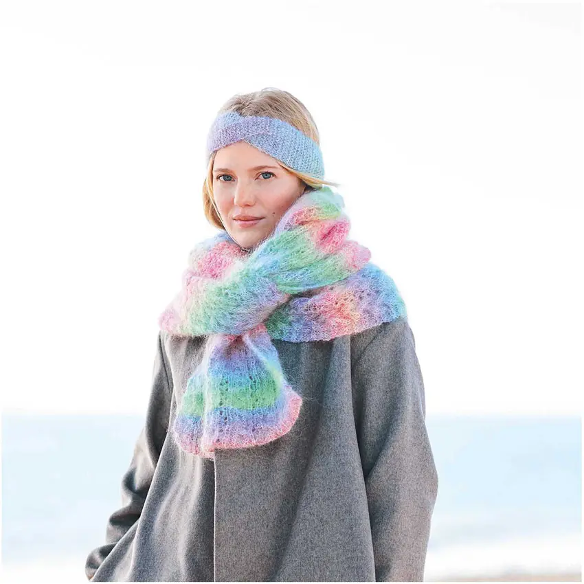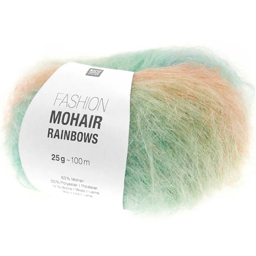 25g motek zawiera 100 metrów ciekawej włóczki Rico Mohair Rainbows, możesz przerabiać ją jako samodzielną nitkę lub dodać na przykład do naszych Ombre Rolls Merino, Efekt WOW murowany!