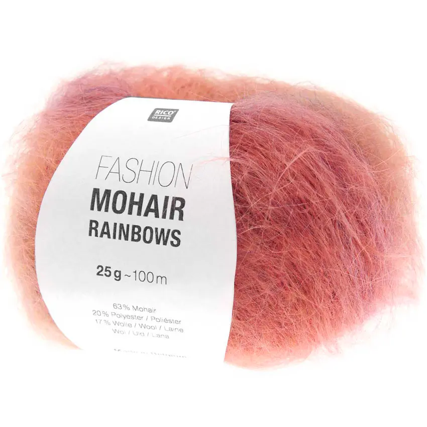 25g motek zawiera 100 metrów ciekawej włóczki Rico Mohair Rainbows, możesz przerabiać ją jako samodzielną nitkę lub dodać na przykład do naszych Ombre Rolls Merino, Efekt WOW murowany!