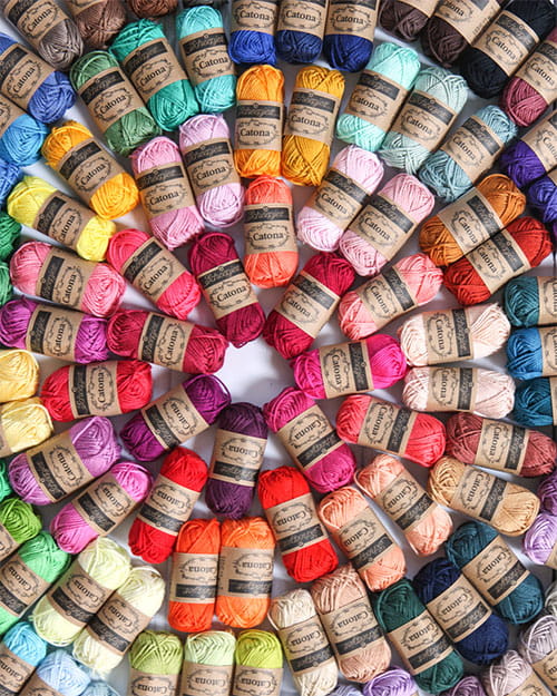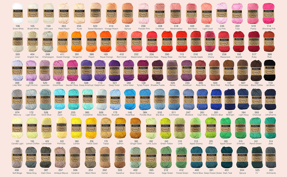 Zestaw włóczki Scheepjes Catona zwiniętej w 10g motki. W zestawie pełna paleta kolorów - aż 109 odcieni.