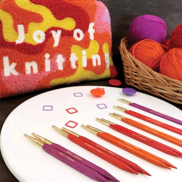 Końcówki drutów w kolorze złota płynnie łączą się ze stalową żyłką pokrytą warstwą przezroczystego nylonu. Dodatkowo, żyłki są wyposażone w system obrotowy, co oznacza, że obracają się swobodnie podczas dziergania i nie skręcają się ani nie plączą. Akcesoria w zestawie Joy of Knitting także są wykończone w kolorach czerwieni, fiolecie i pomarańczy, idealnie komponując się z końcówkami drutów. Wisienką na torcie tego zestawu są etui: etui na druty wyhaftowane techniką punch needle w pięknych, jasnych kolorach oraz pasujące etui na akcesoria.
